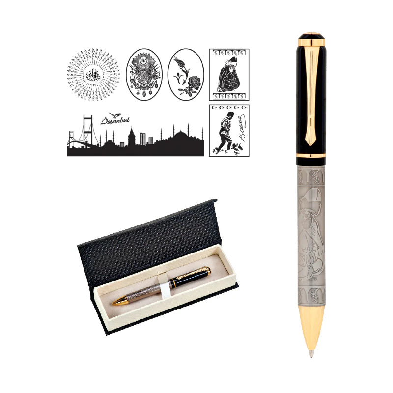 • Kabartma figürlü, şık metal tükenmez kalem seti
