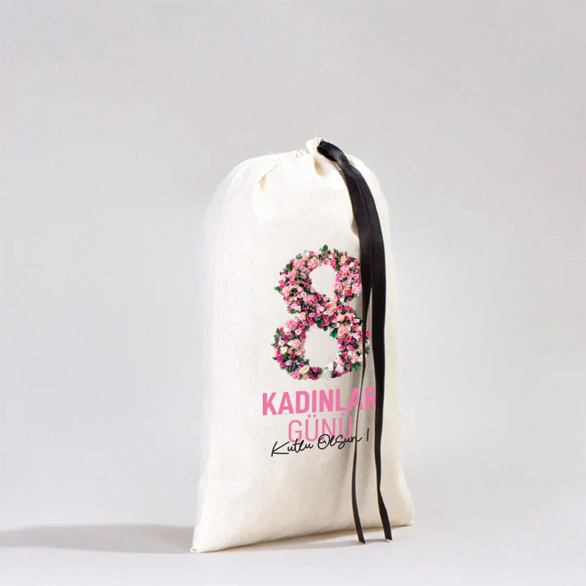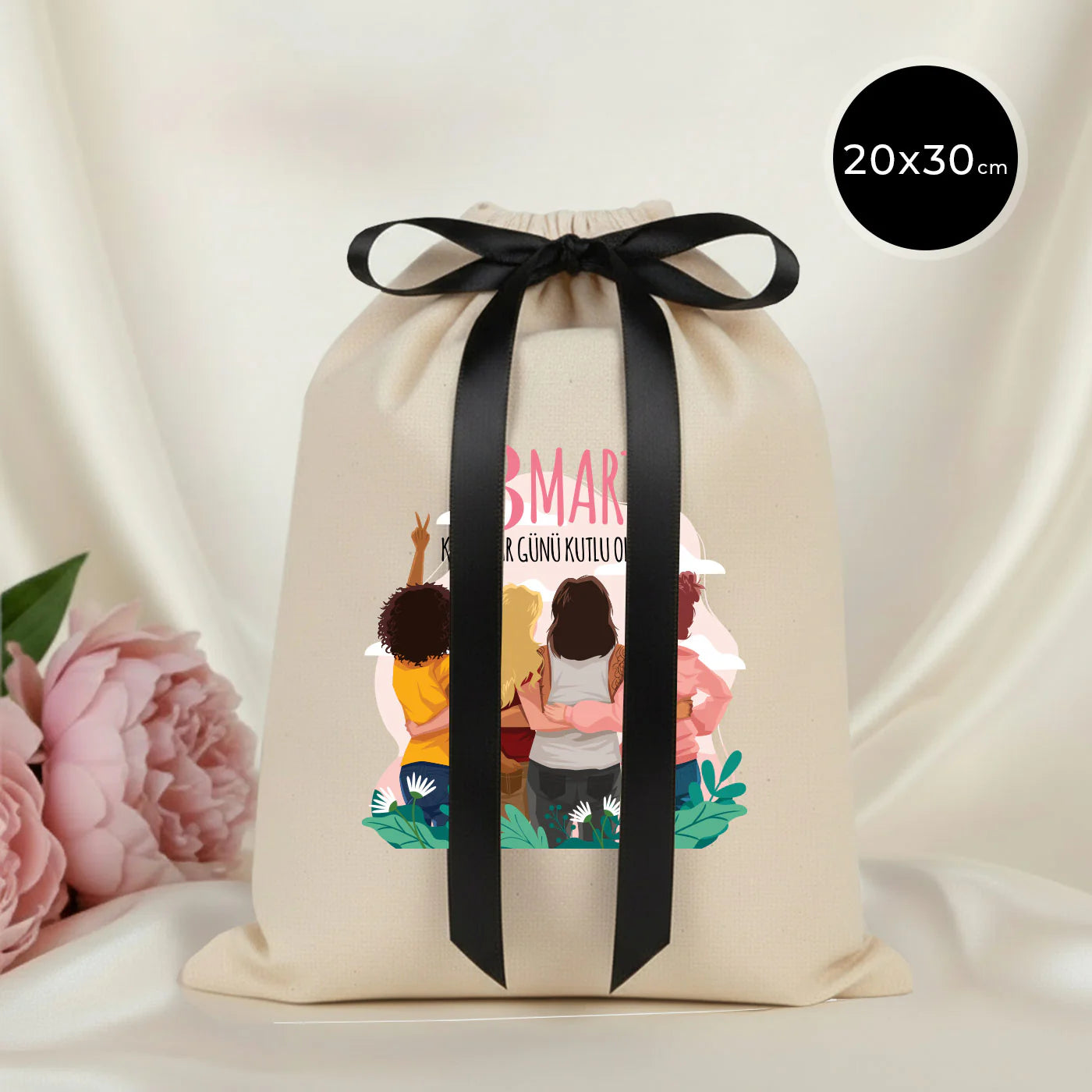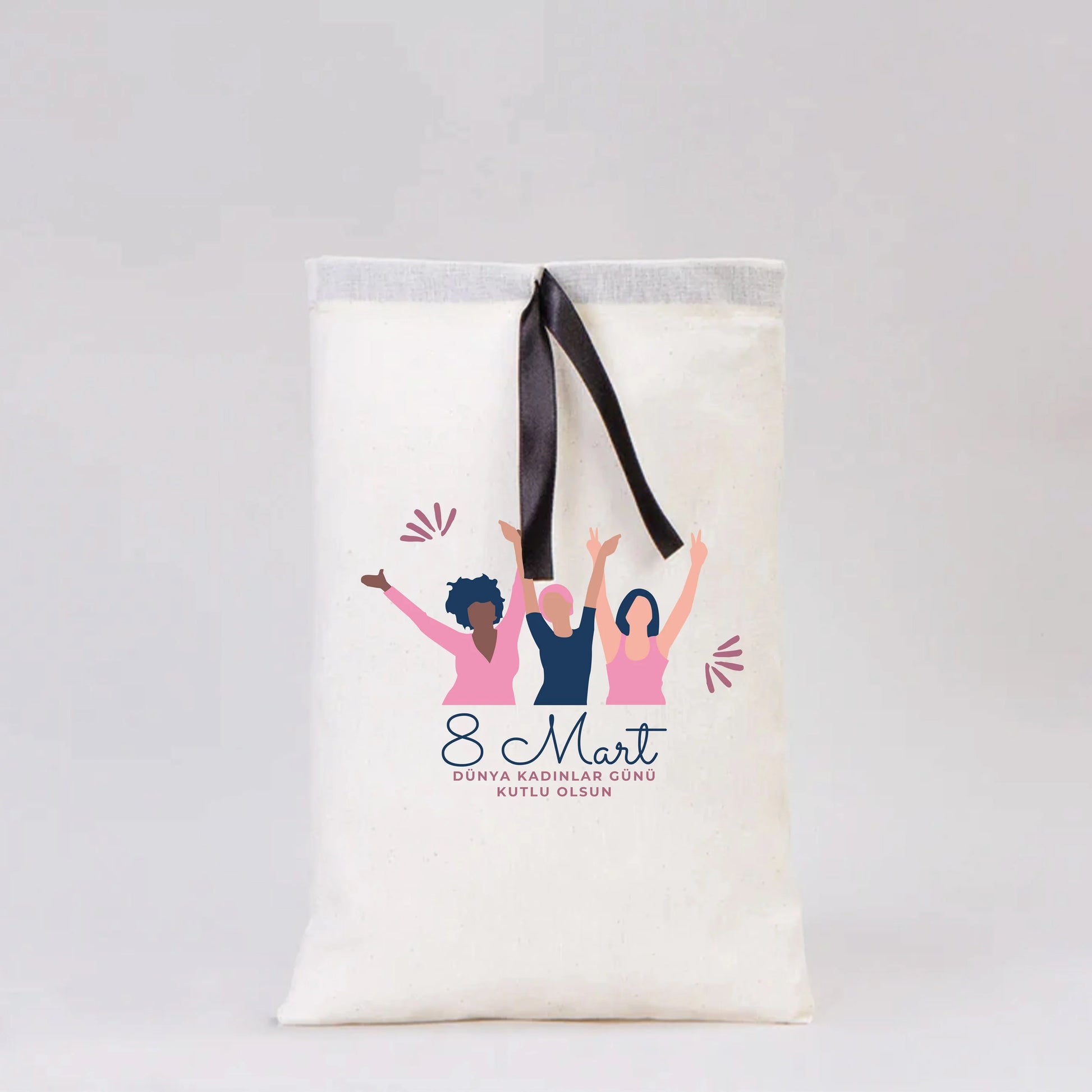 20x30 Siyah Kurdeleli Bez Kese – Kadınlar Günü Hediyesi