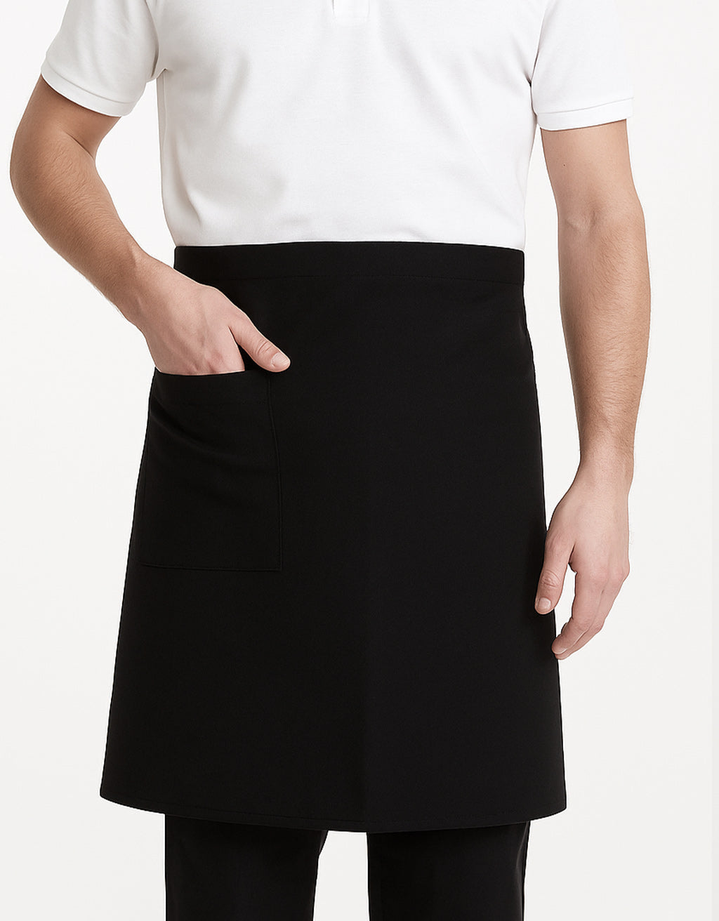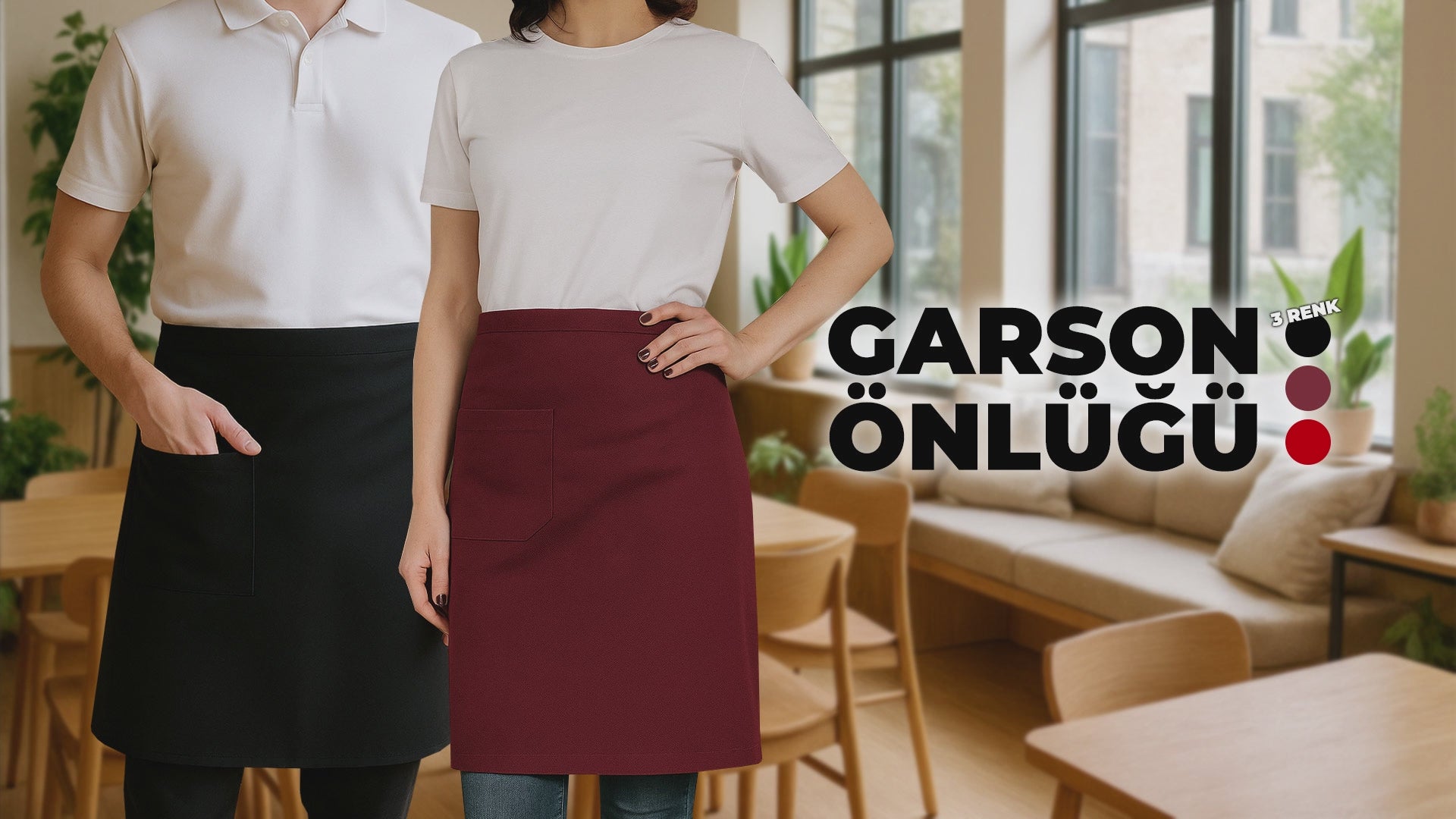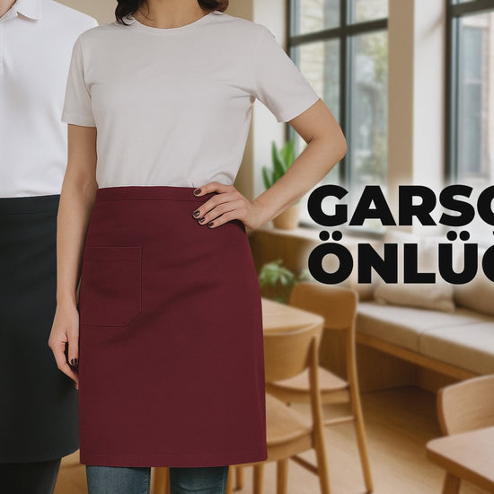 Bordo, kırmızı ve siyah renk kumaşlardan dikilmiş bel bağlamalı cepli garson önlüğü; Kafe, restoran, otel, ve diğer hizmet sektörü mutfaklarında kullanılmak üzere belden bağlamalıdır. Leke tutmaz, su geçirmez ve nemli bez ile rahatlıkla silinebilir.