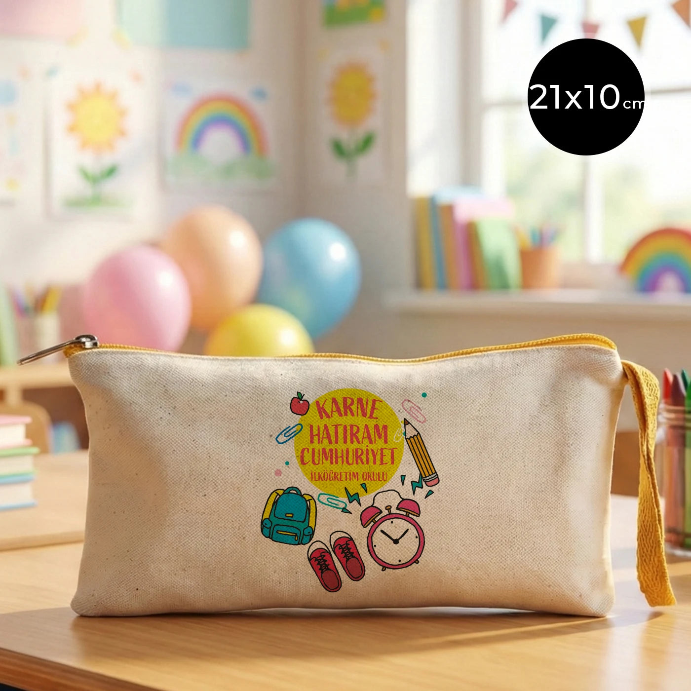 • Kalem, silgi ve küçük kırtasiye ürünlerini düzenli şekilde taşımak için idealdir. Karne günü, sınıf etkinlikleri ve yıl sonu organizasyonlarında öğrencilere özel anlamlı bir hatıra olarak kullanılabilir.