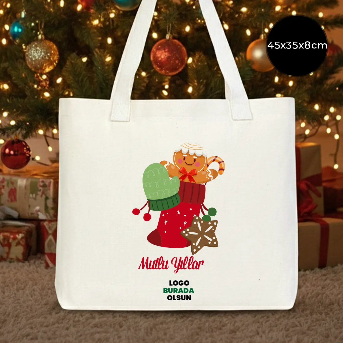 Yeniyıl Baskılı Modern Kanvas Çanta - Dıştan Örgü Kulp 45x35x8 cm (Özelleştirilebilir)