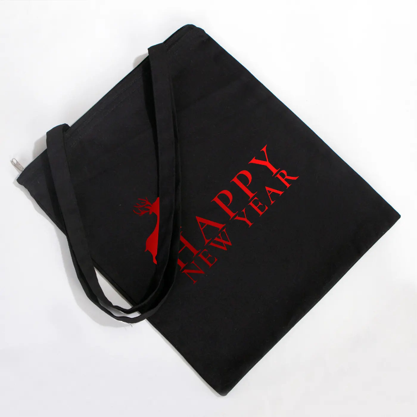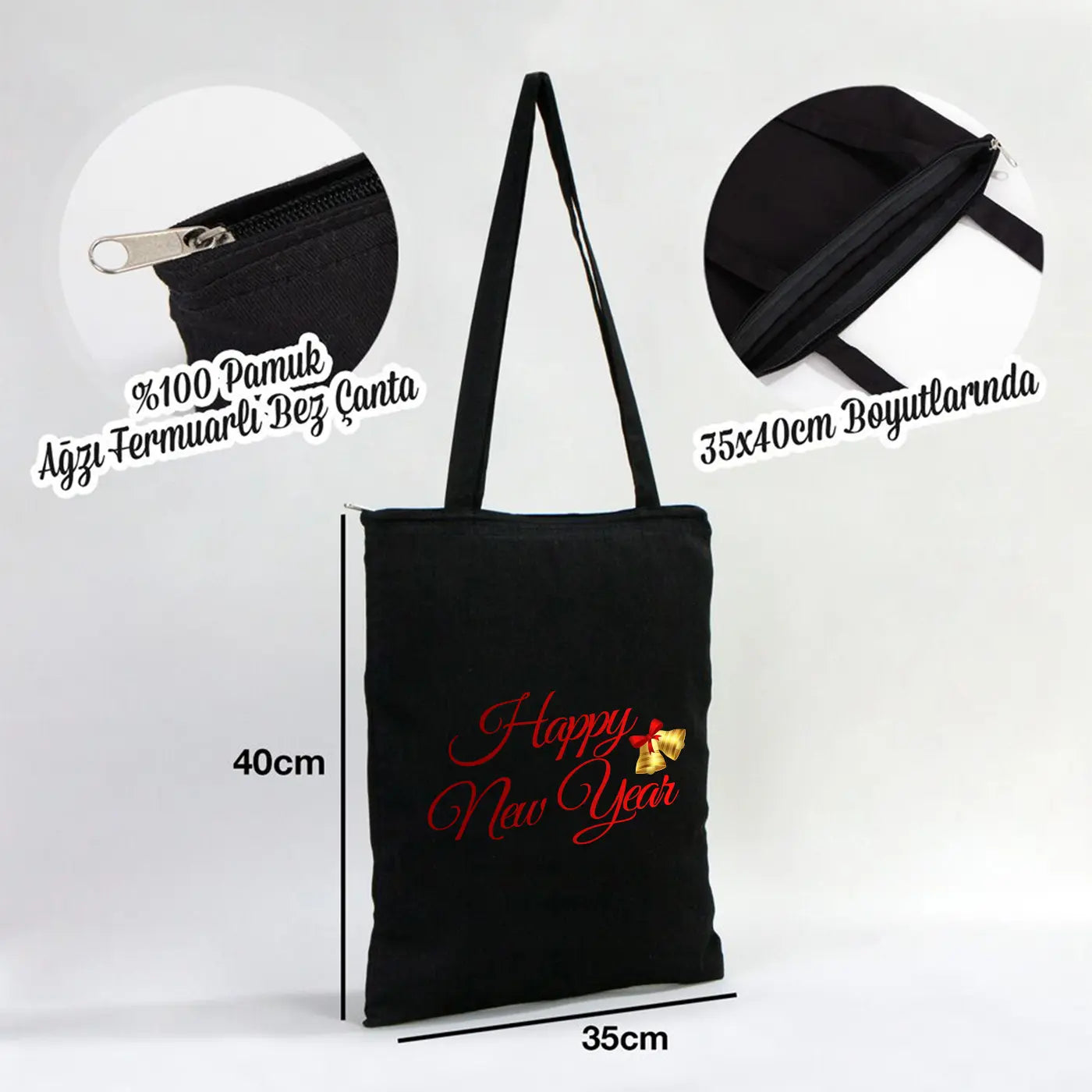 Yeni Yıl Tema Tasarımlı Fermuarlı Siyah Bez Çanta 35x40cm (Özelleştirilebilir)