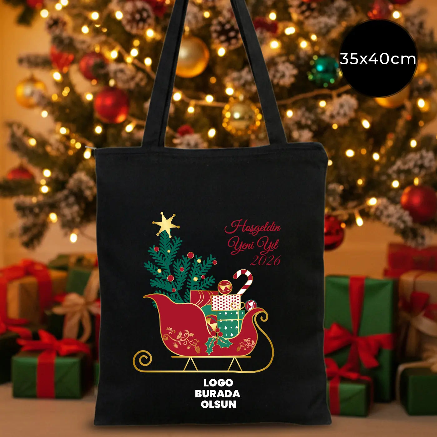 Yeni Yıl Hediyelik Siyah Fermuarlı Gabardin Çanta 35x40 cm – Özelleştirilebilir