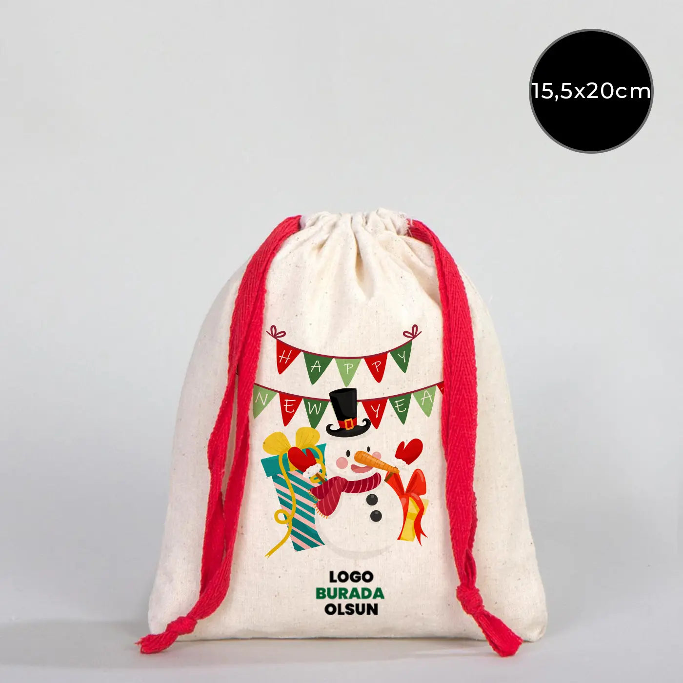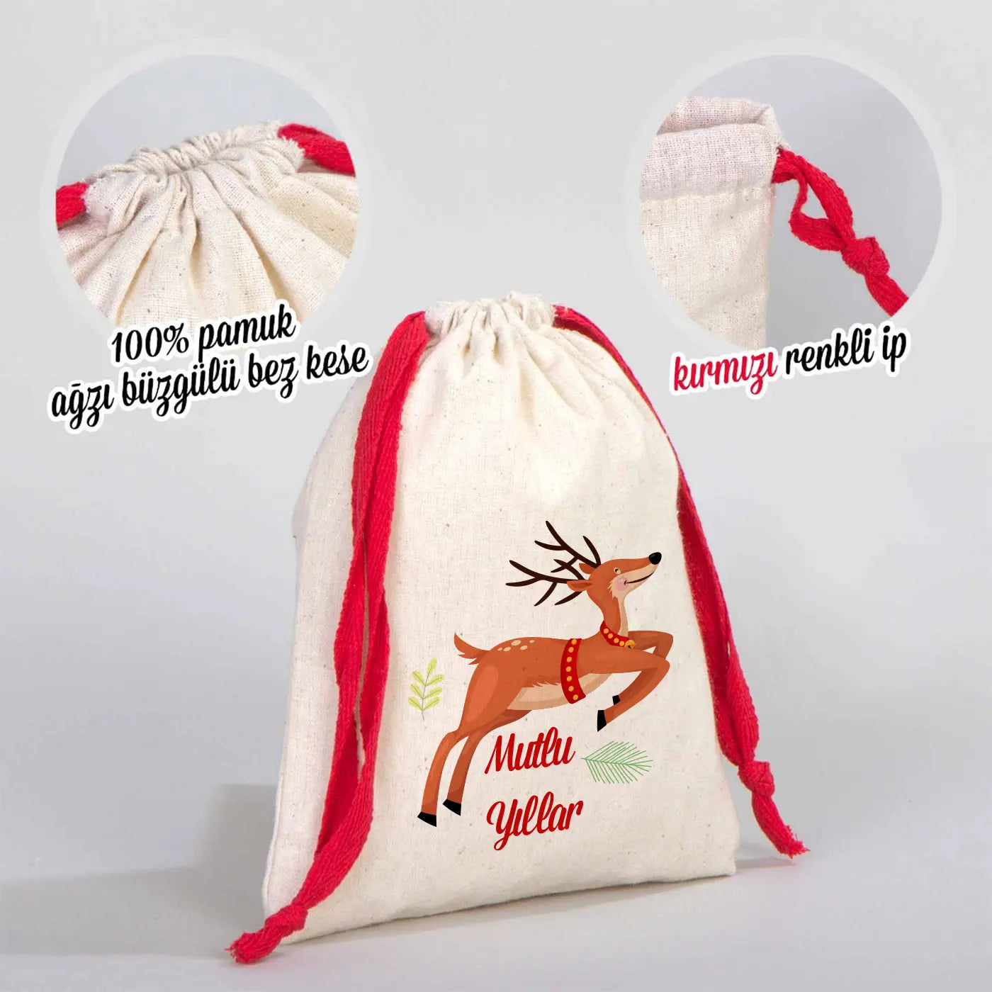 Yılbaşı Desenli Bez Kese 15,5x20 cm - Renkli İp - Kırmızı (Özelleştirilebilir)
