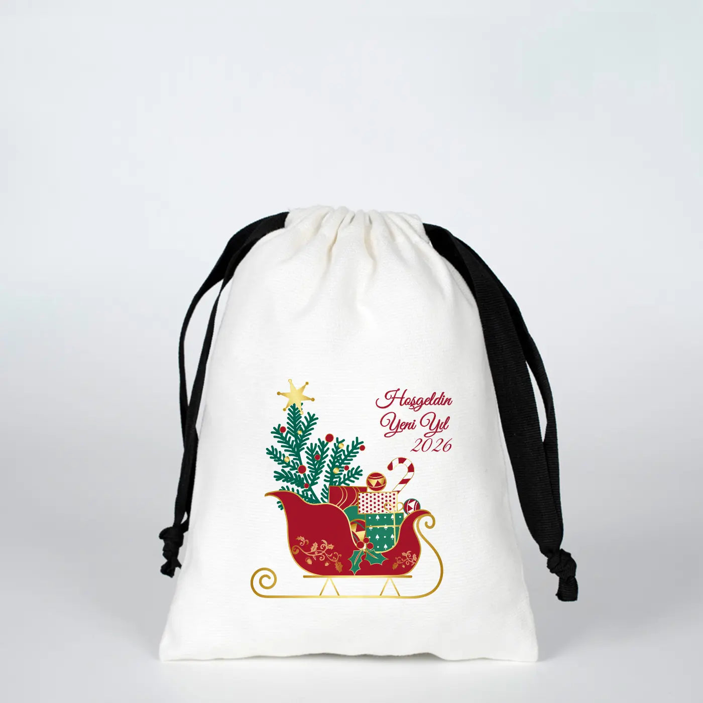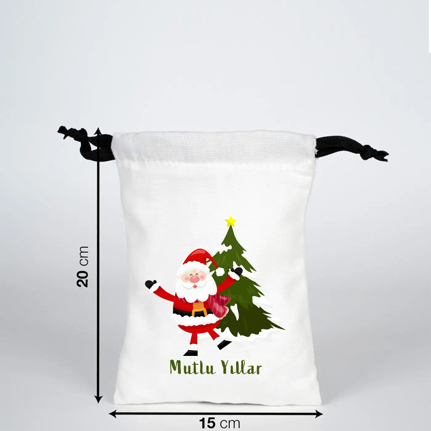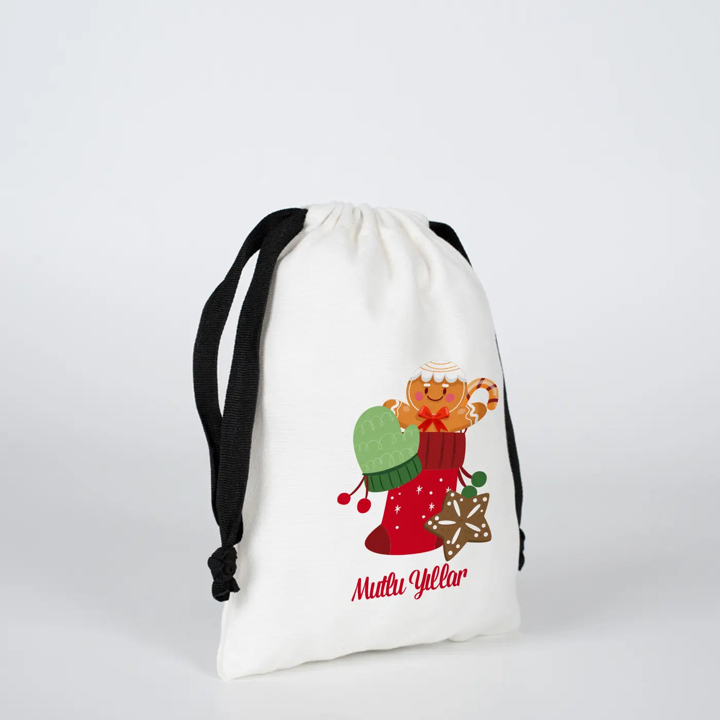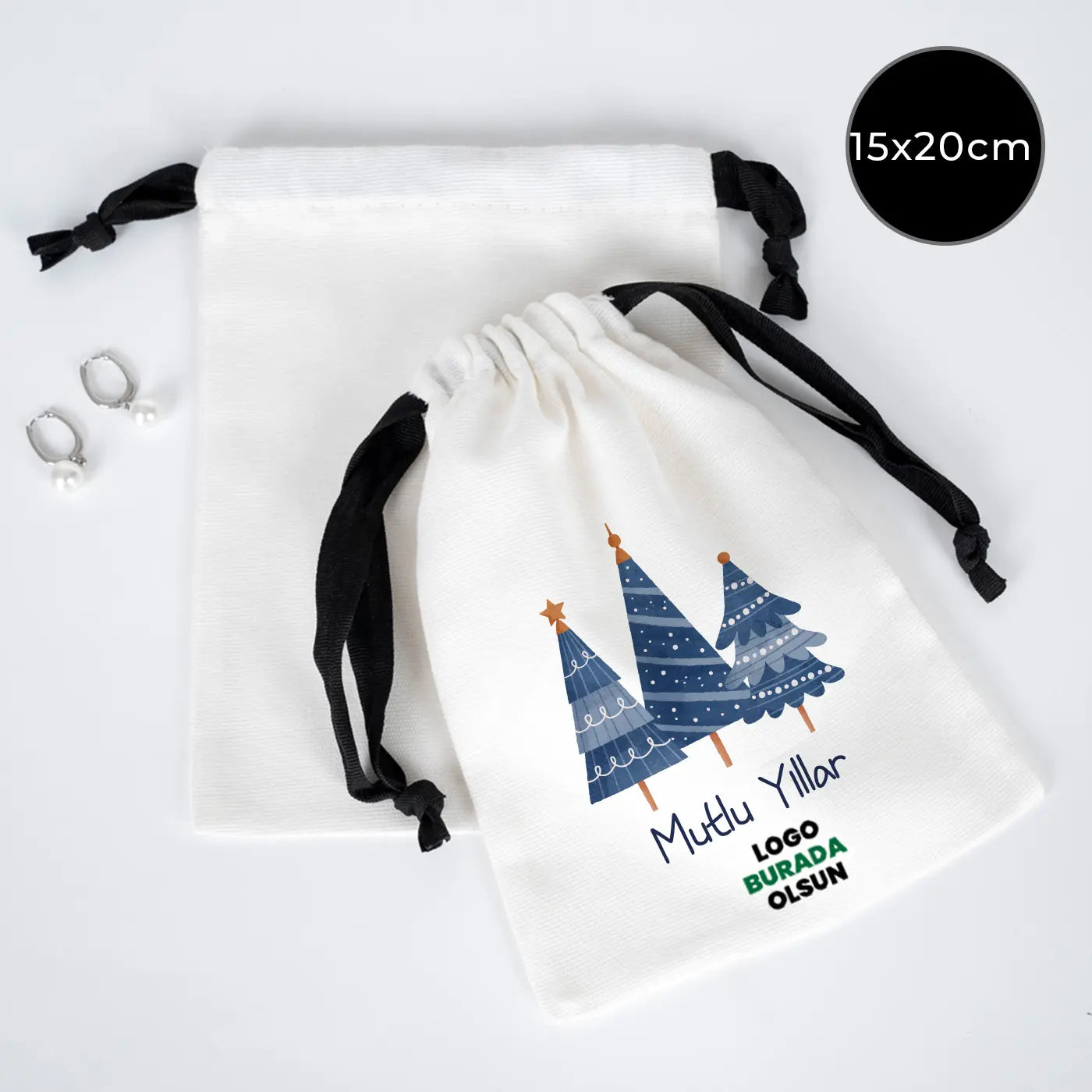 Yeni Yıla Özel Siyah İpli Bez Kese - 15x20cm Beyaz Panama Kumaş