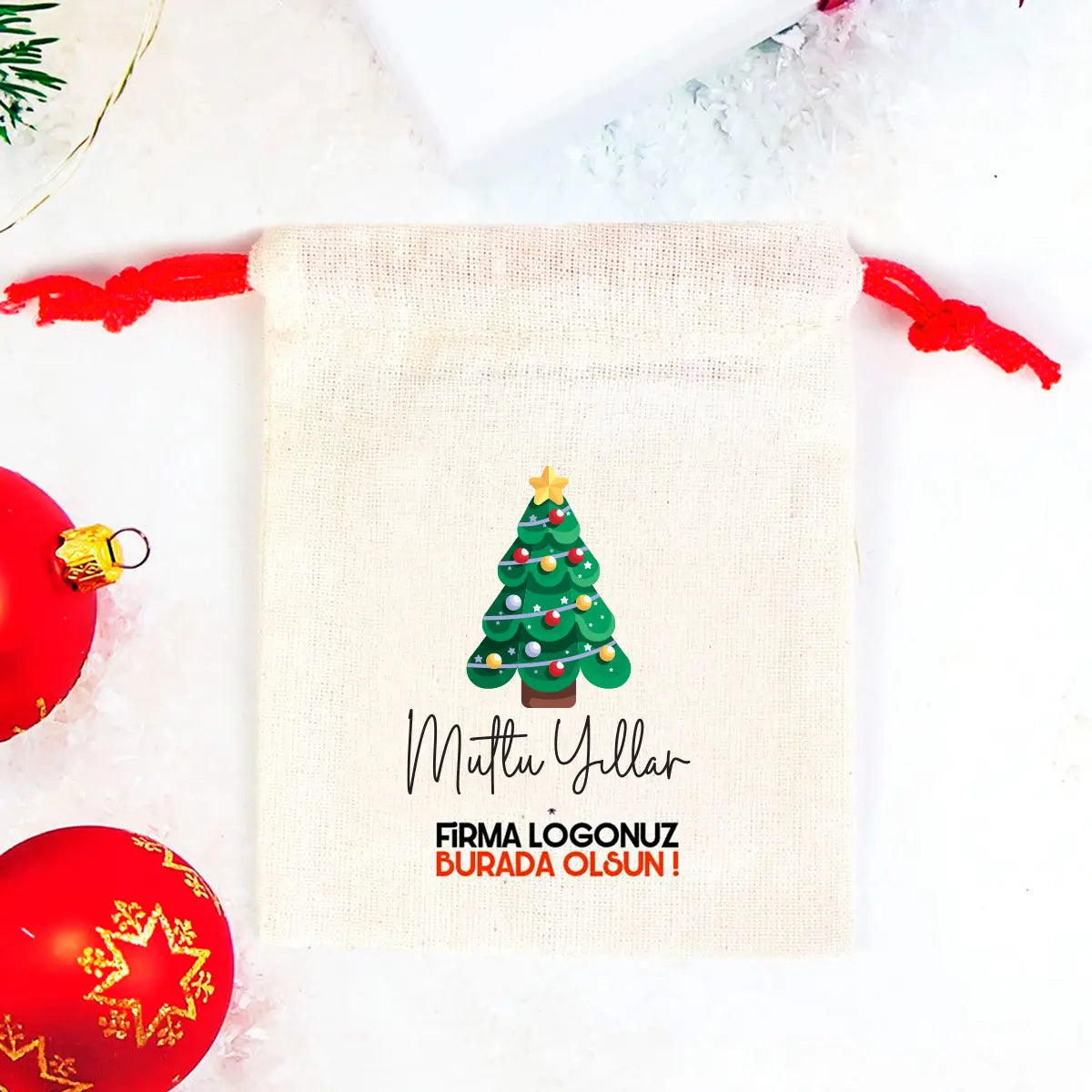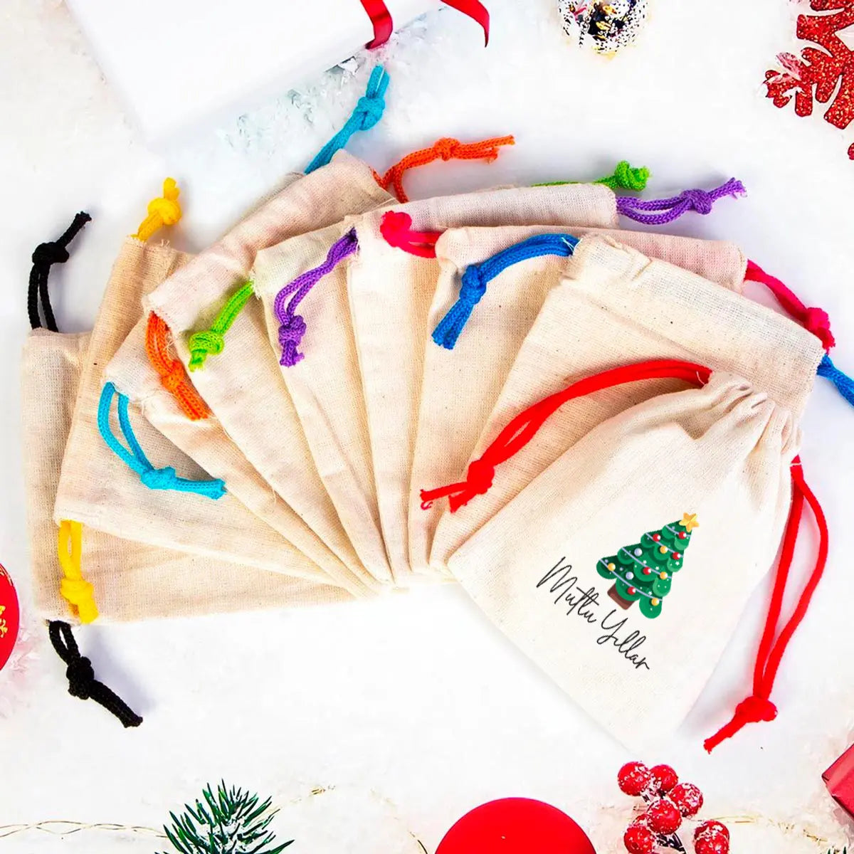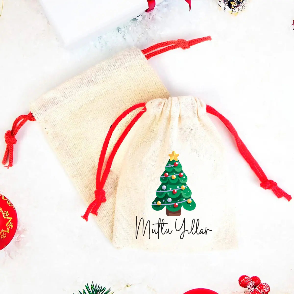 Yılbaşı Ağacı Çam Baskılı Bez Kese Modeli - Renkli İp (Özelleştirilebilir)