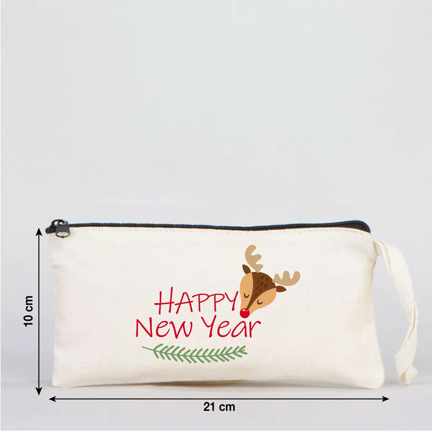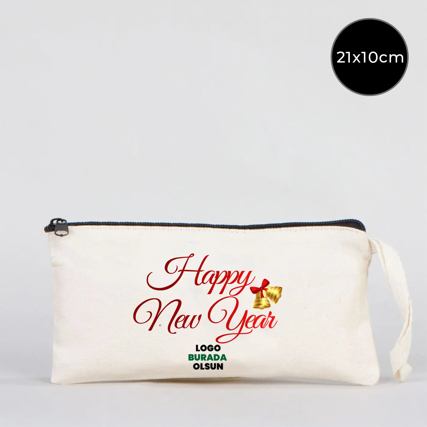 Yılbaşı Baskılı Bez Kalemlik & Makyaj Çantası 21x10 cm (Özelleştirilebilir)
